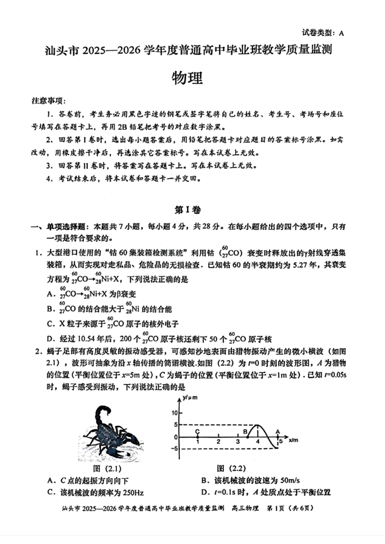 汕头市2025—2026学年度普通高中毕业班教学质量监测 物理.pdf