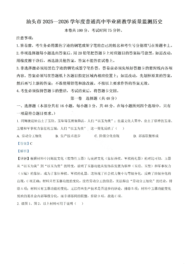 汕头市2025—2026学年度普通高中毕业班教学质量监测 历史答案.pdf