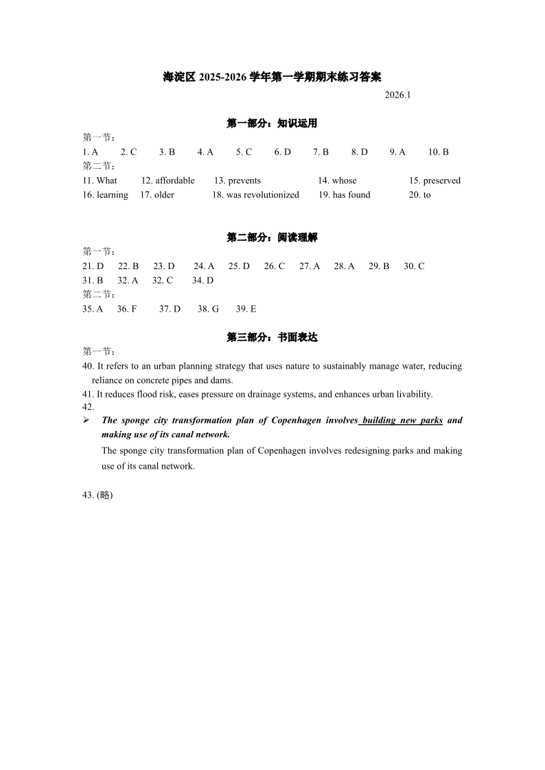 北京市海淀区2025一2026学年第一学期期末练习 英语答案.pdf