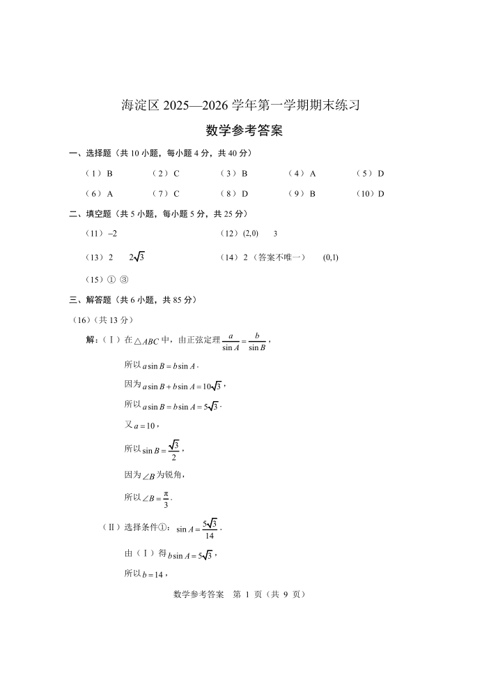 北京市海淀区2025一2026学年第一学期期末练习 数学答案.pdf