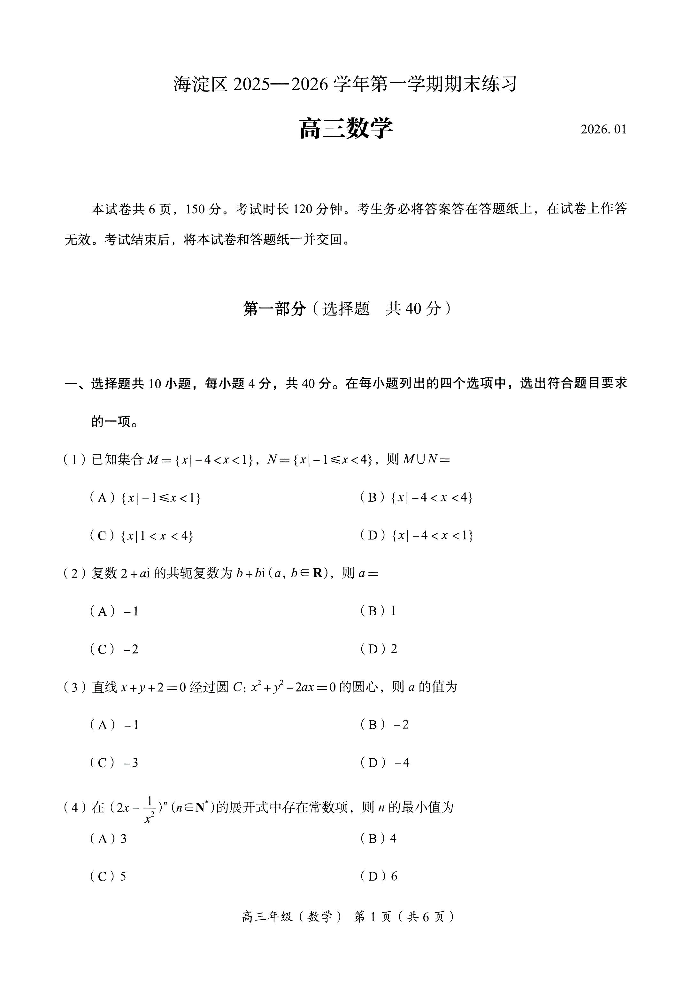 北京市海淀区2025一2026学年第一学期期末练习 数学.pdf