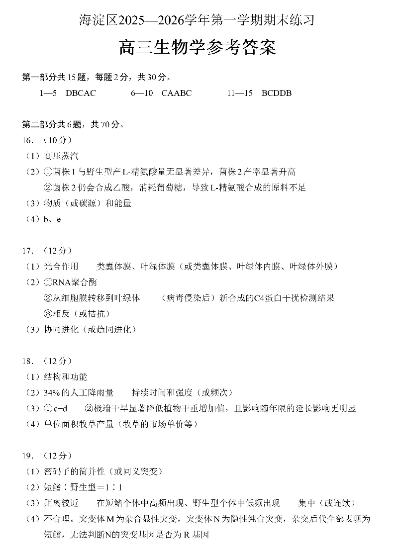 北京市海淀区2025一2026学年第一学期期末练习 生物答案.pdf