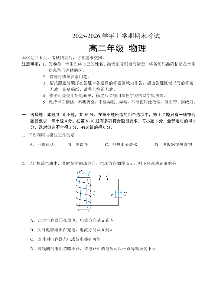 吉林省长春市四校2025-2026学年上学期高二年级期末联考考试 物理试题(含答案).pdf