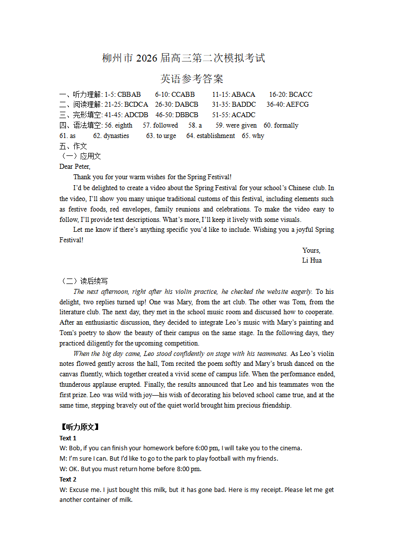 柳州市2026届高三第二次模拟考试 英语答案.pdf