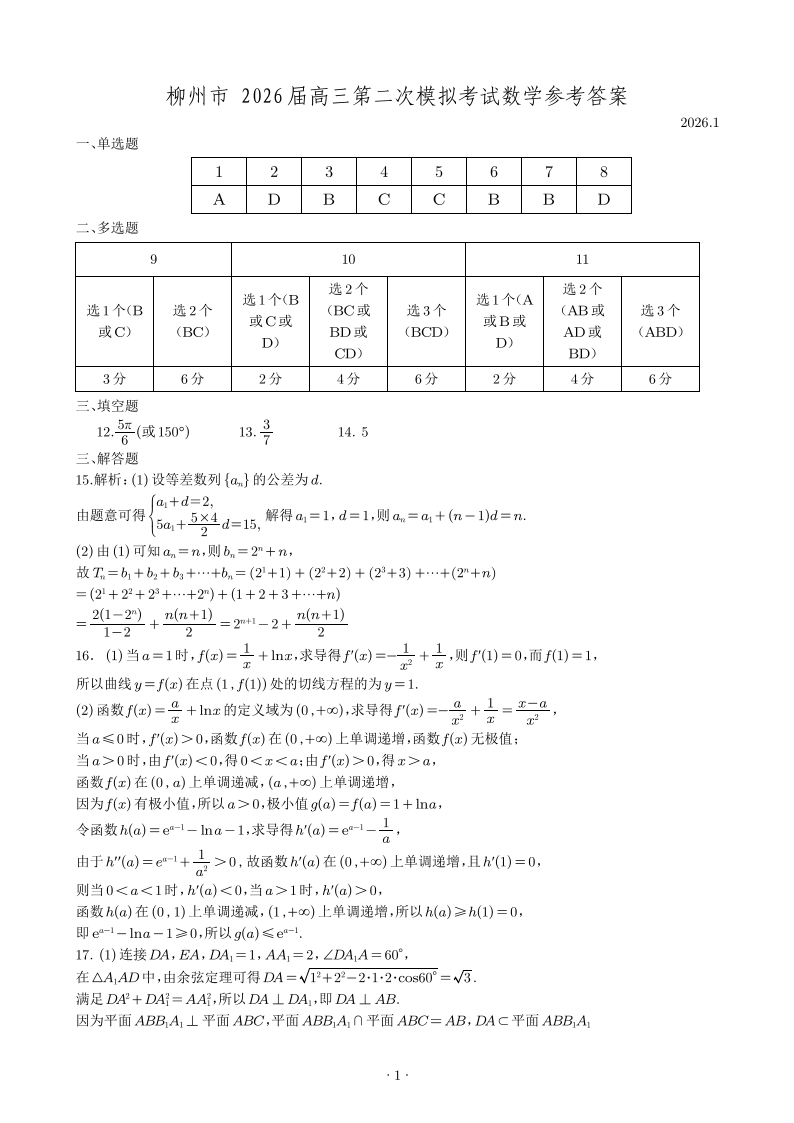 柳州市2026届高三第二次模拟考试 数学答案.pdf
