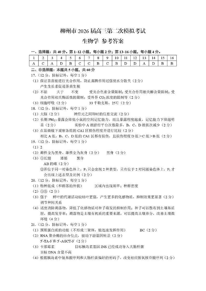 柳州市2026届高三第二次模拟考试 生物答案.pdf