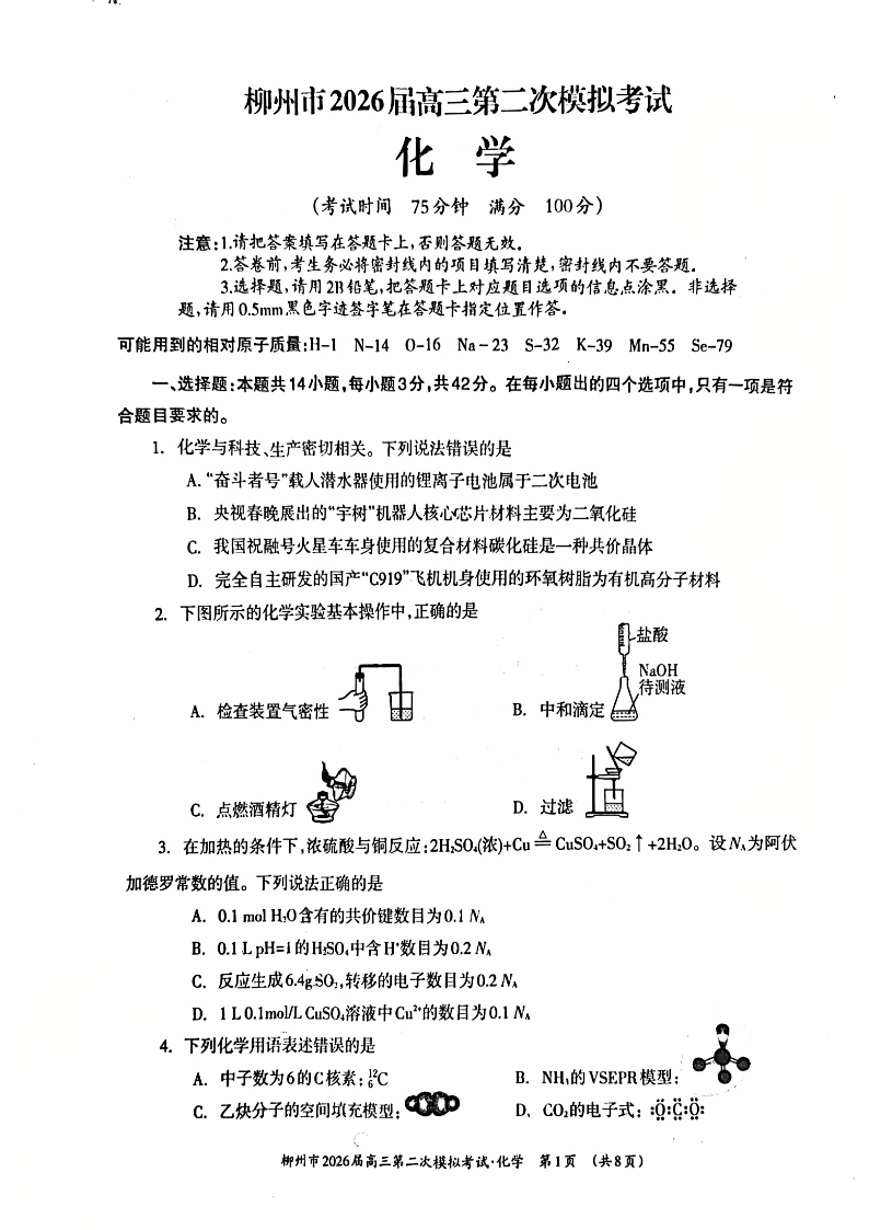 柳州市2026届高三第二次模拟考试 化学.pdf