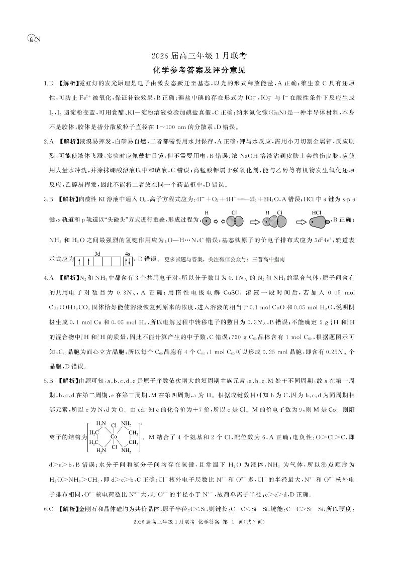 河南省百师联盟2025-2026学年高三上学期1月期末联考 化学答案.pdf