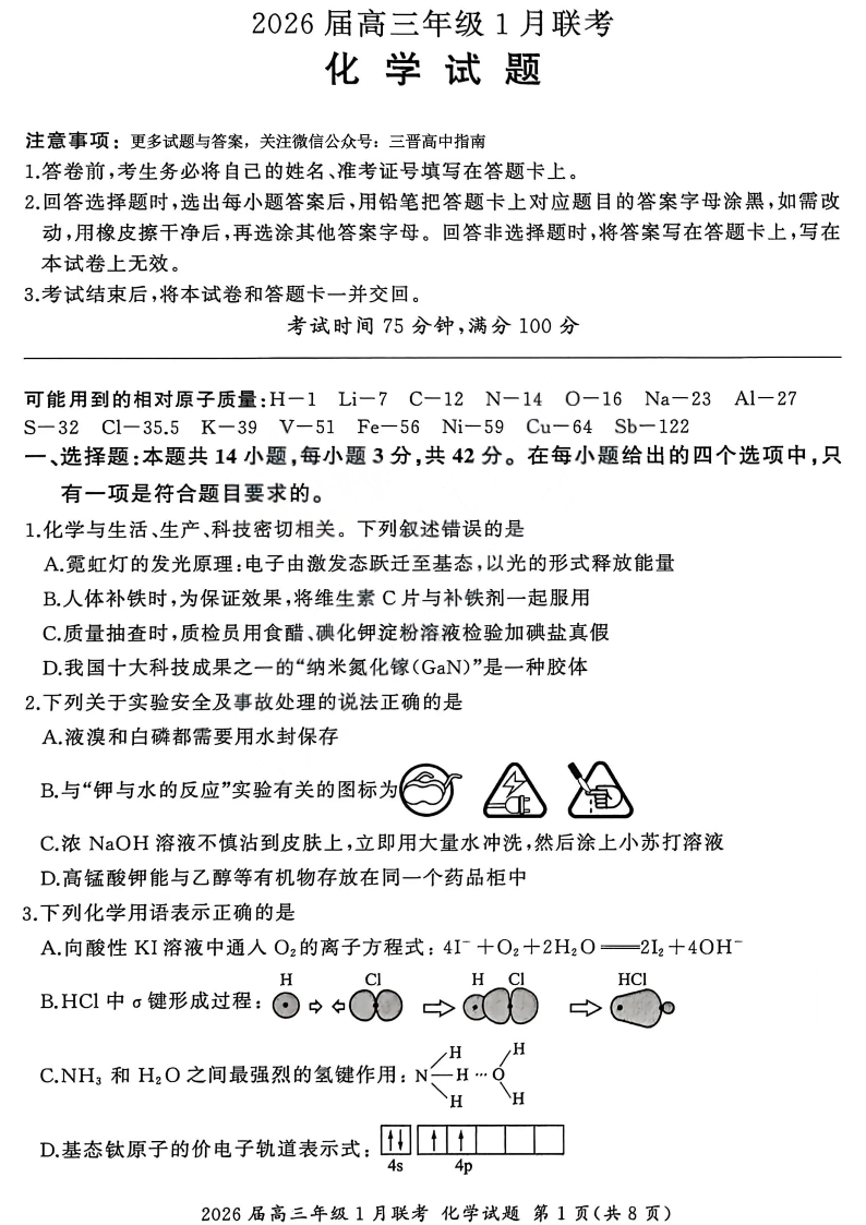 河南省百师联盟2025-2026学年高三上学期1月期末联考 化学.pdf