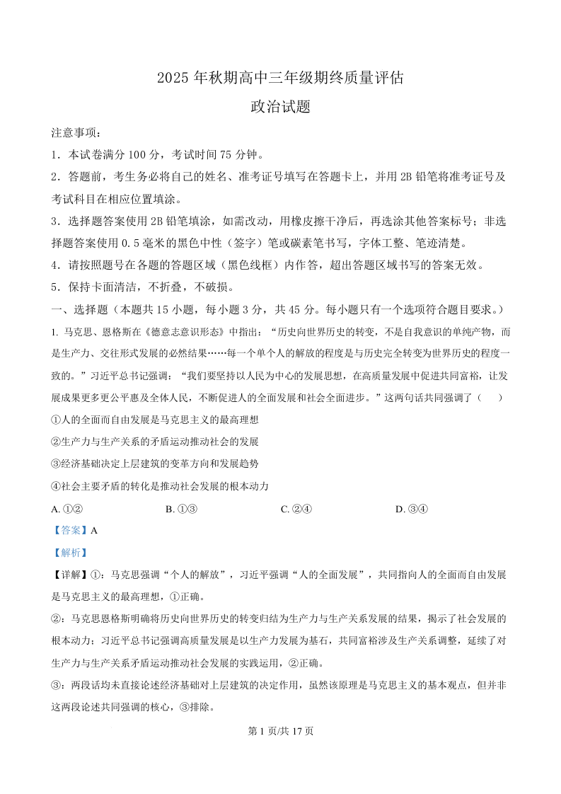 河南省南阳市2025年秋期高中三年级期终质量评估 政治答案.docx