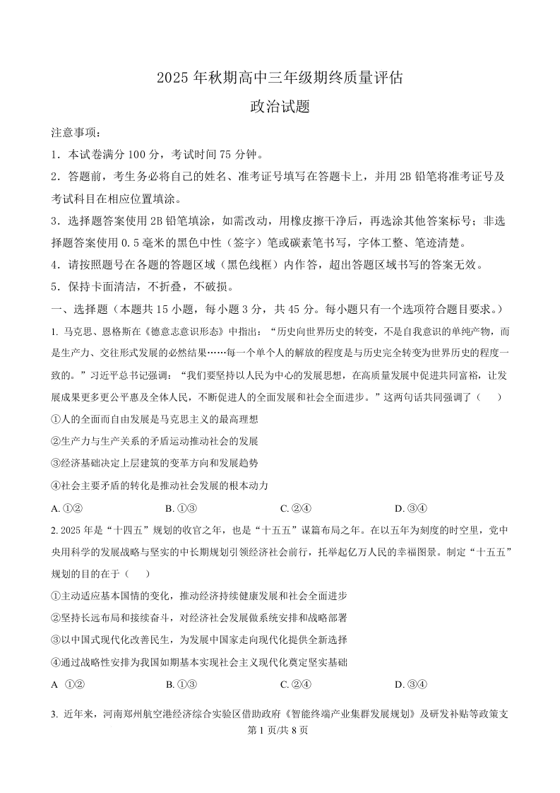 河南省南阳市2025年秋期高中三年级期终质量评估 政治.docx