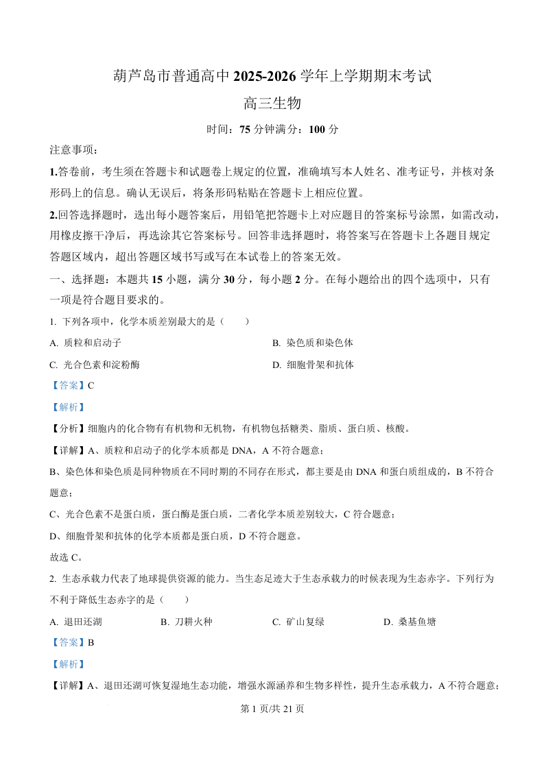 辽宁省葫芦岛市普通高中2025-2026学年高三上学期期末考试 生物答案.docx