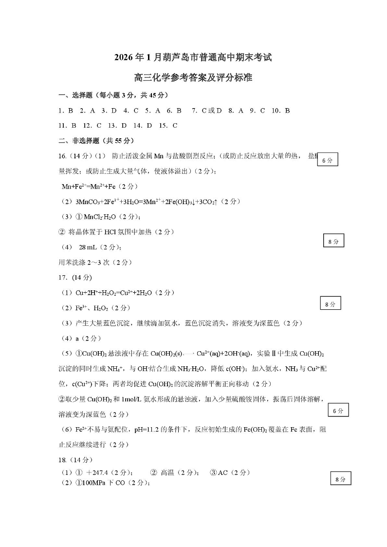 辽宁省葫芦岛市普通高中2025-2026学年高三上学期期末考试 化学答案.pdf