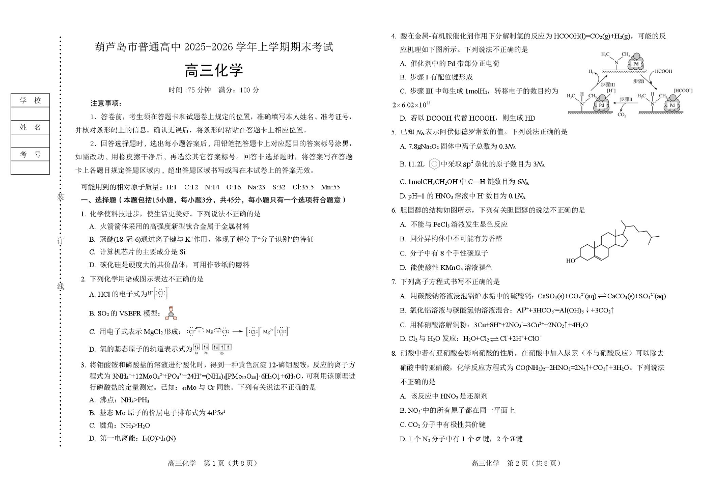 辽宁省葫芦岛市普通高中2025-2026学年高三上学期期末考试 化学.pdf