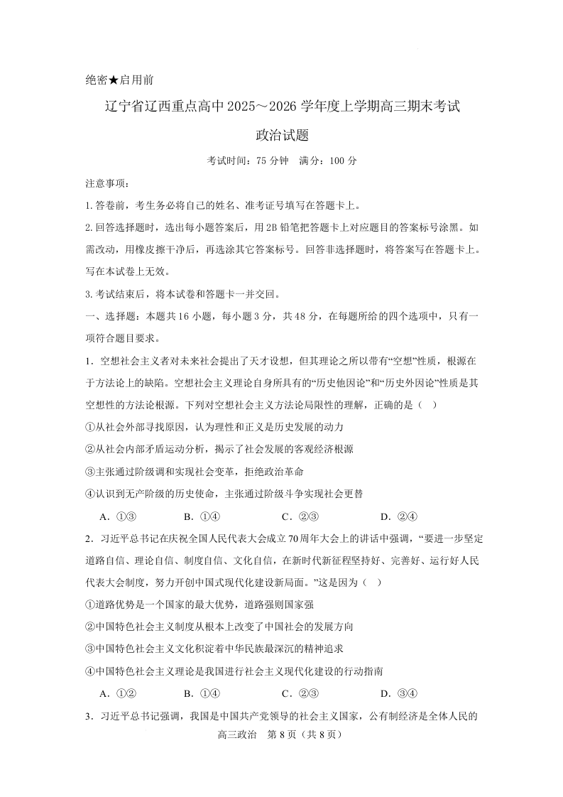 辽西重点高中2025-2026学年高三上学期1月期末考试 政治.docx