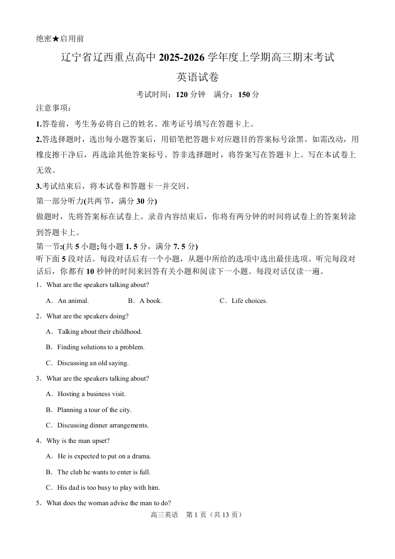 辽西重点高中2025-2026学年高三上学期1月期末考试 英语.docx