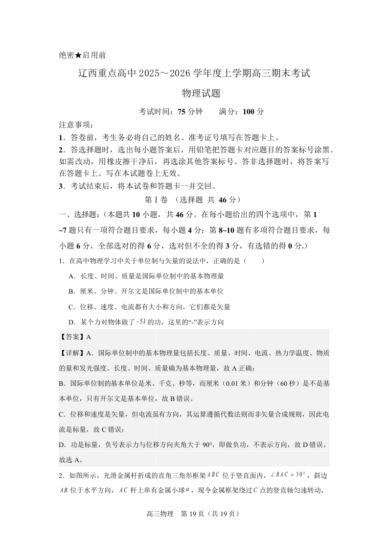辽西重点高中2025-2026学年高三上学期1月期末考试 物理答案.docx