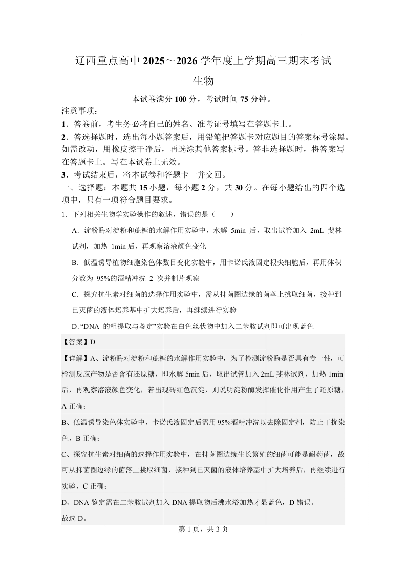 辽西重点高中2025-2026学年高三上学期1月期末考试 生物答案.docx