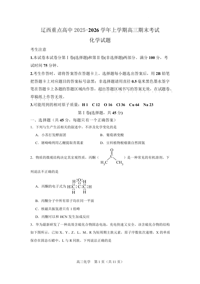 辽西重点高中2025-2026学年高三上学期1月期末考试 化学.docx