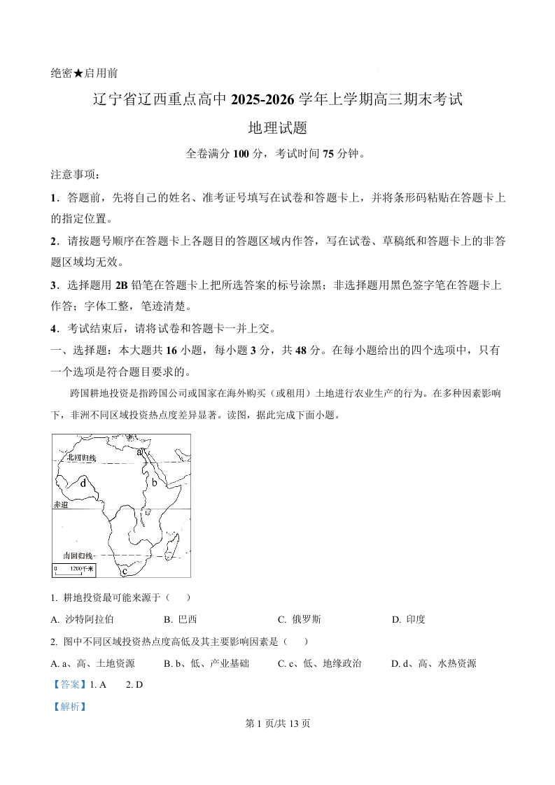 辽西重点高中2025-2026学年高三上学期1月期末考试 地理答案.docx