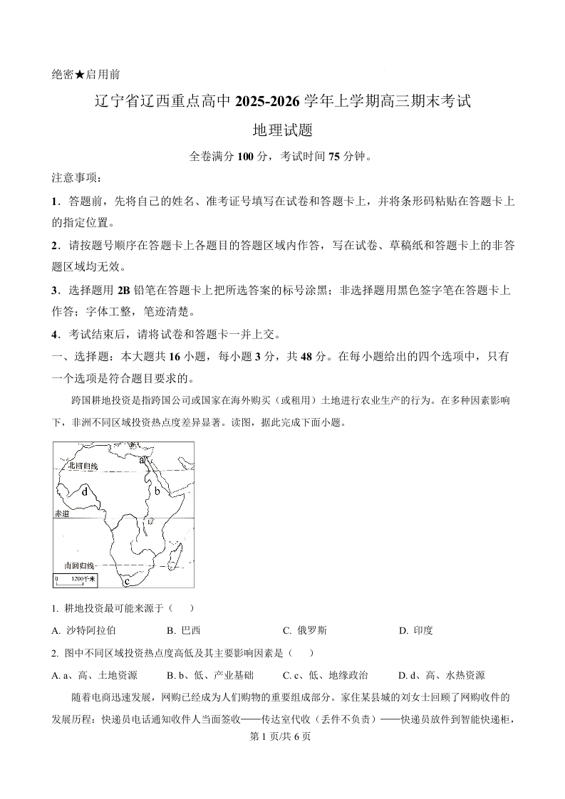 辽西重点高中2025-2026学年高三上学期1月期末考试 地理.docx