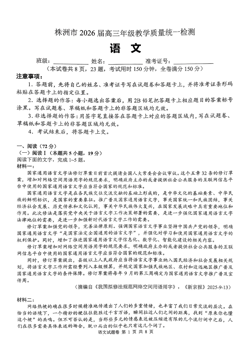 湖南省株洲市2026届高三年级教学质量统一检测 语文.pdf