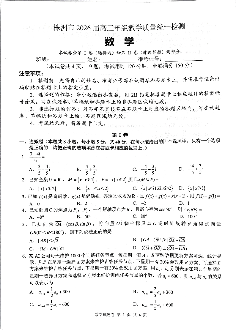 湖南省株洲市2026届高三年级教学质量统一检测 数学.pdf
