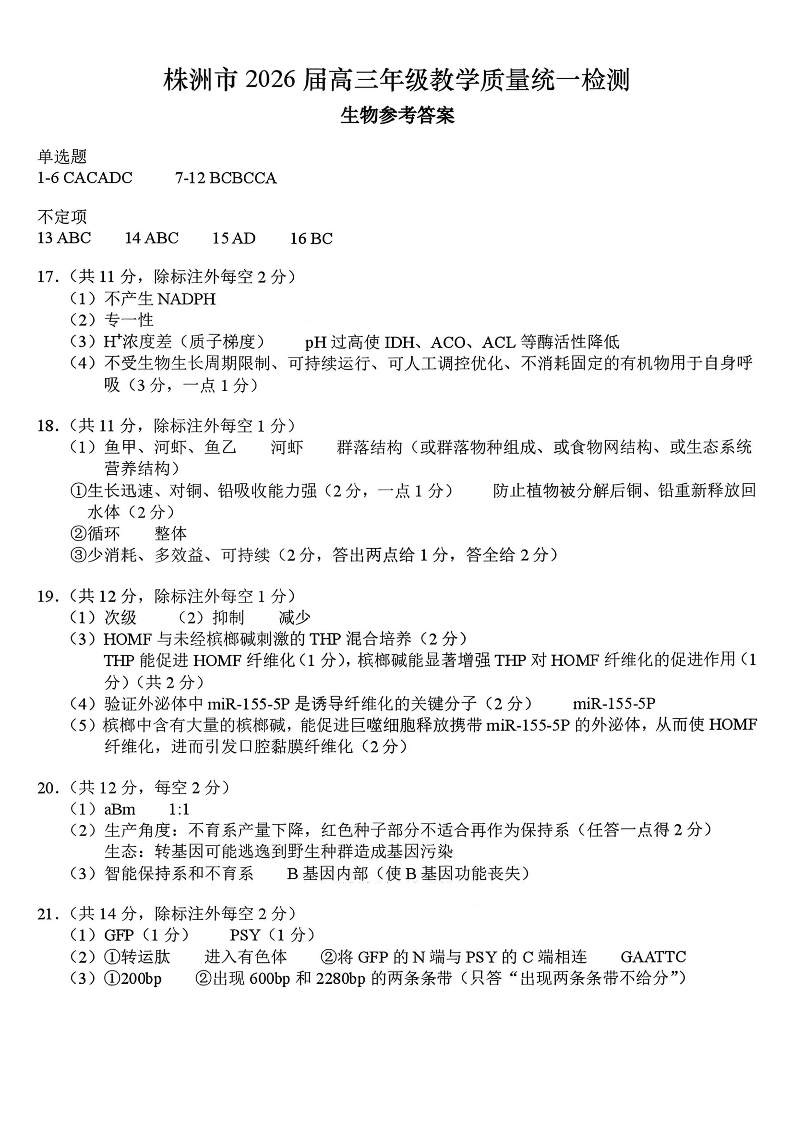 湖南省株洲市2026届高三年级教学质量统一检测 生物答案.pdf
