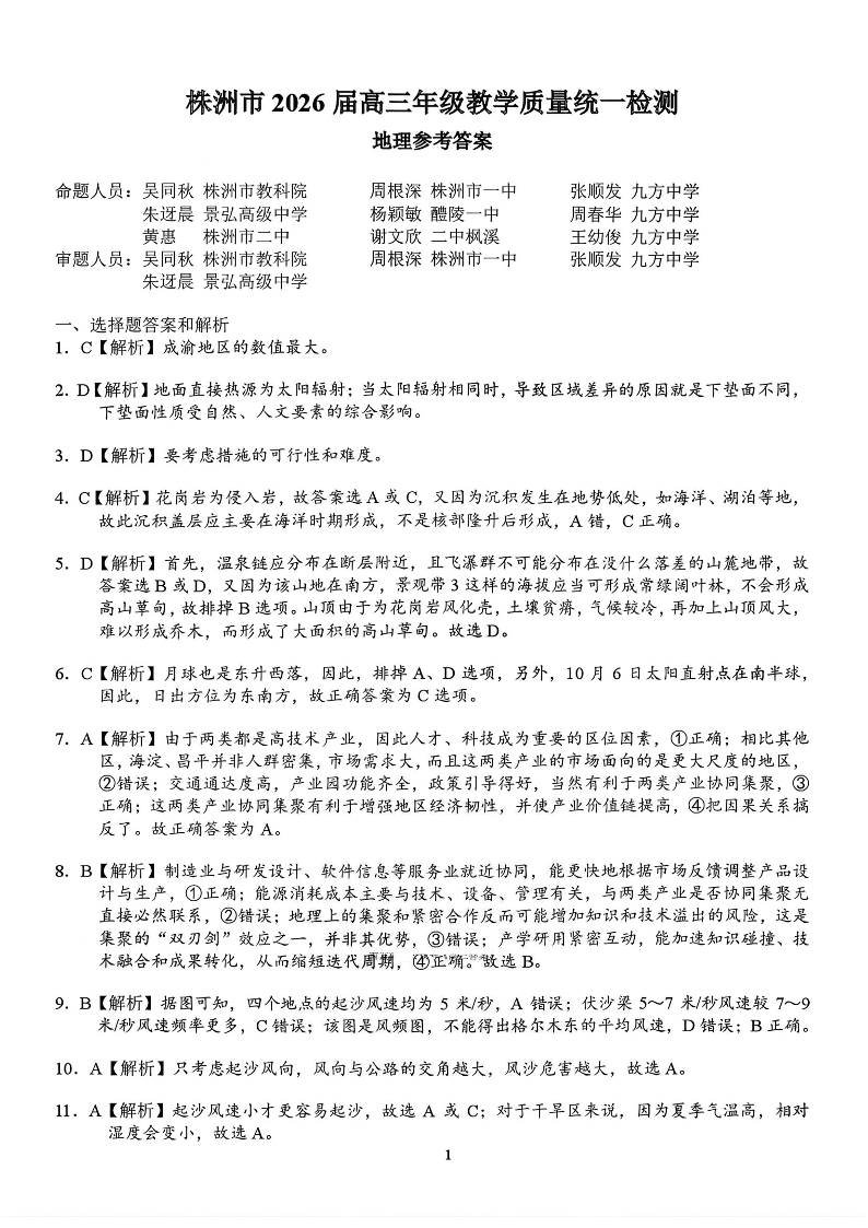湖南省株洲市2026届高三年级教学质量统一检测 地理答案.pdf
