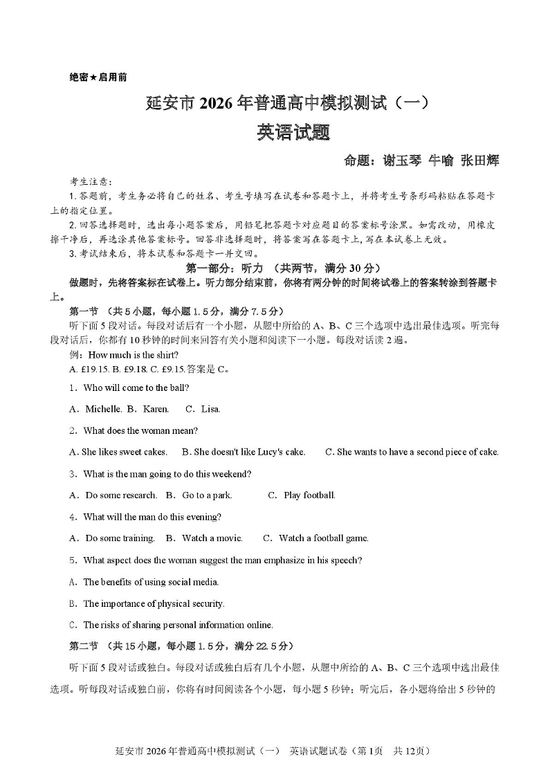 陕西省延安市2026年高三普通高中模拟测试(一)英语.pdf