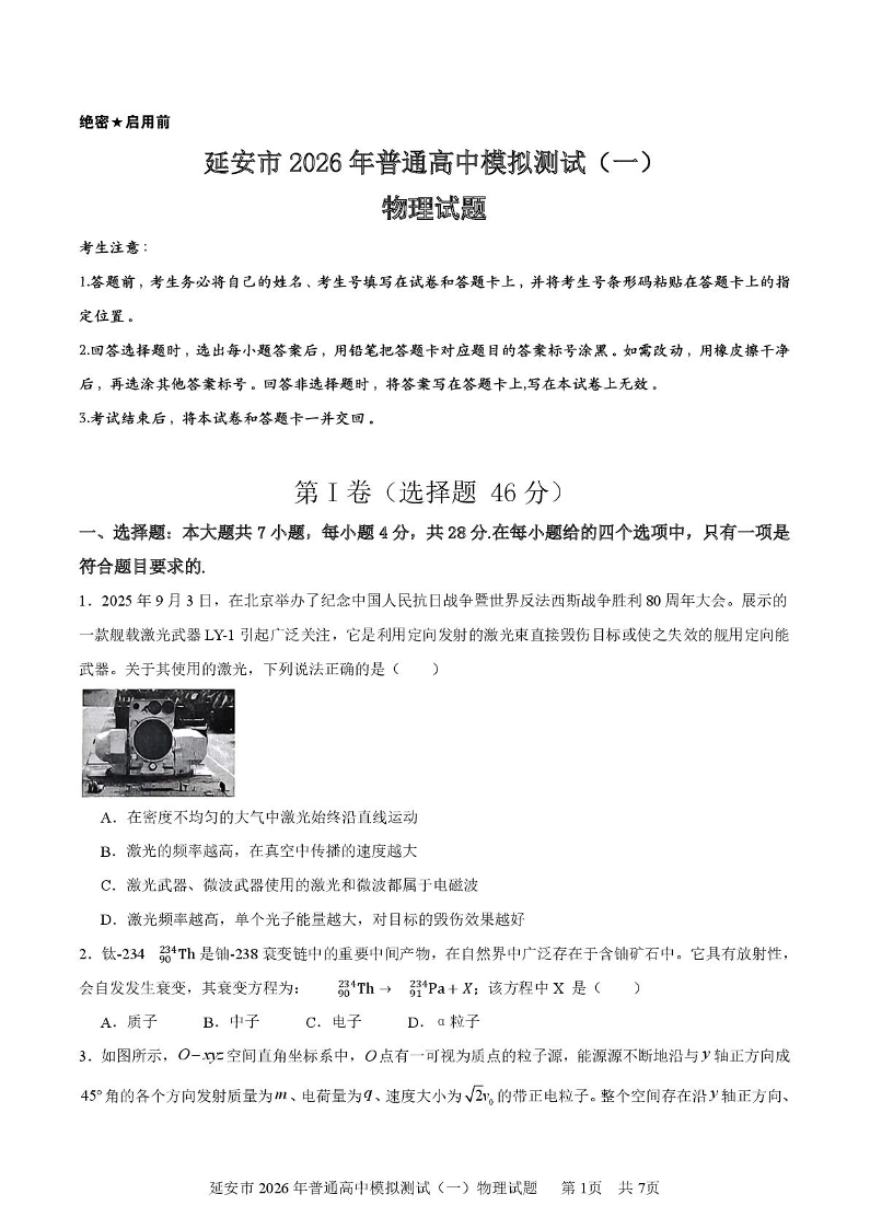 陕西省延安市2026年高三普通高中模拟测试(一)物理.pdf