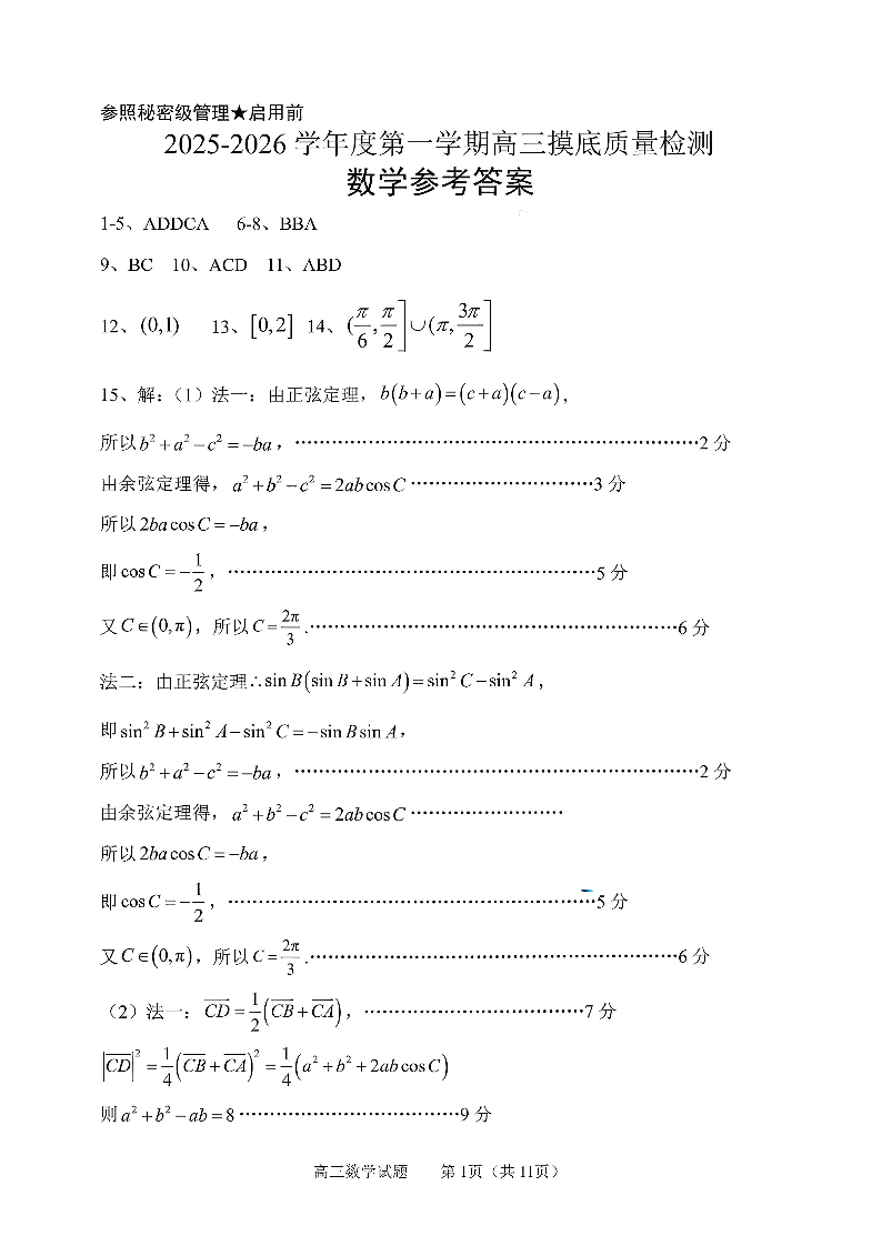 数学答案-2026届山东省淄博市第一学期高三摸底质量检测(期末).pdf