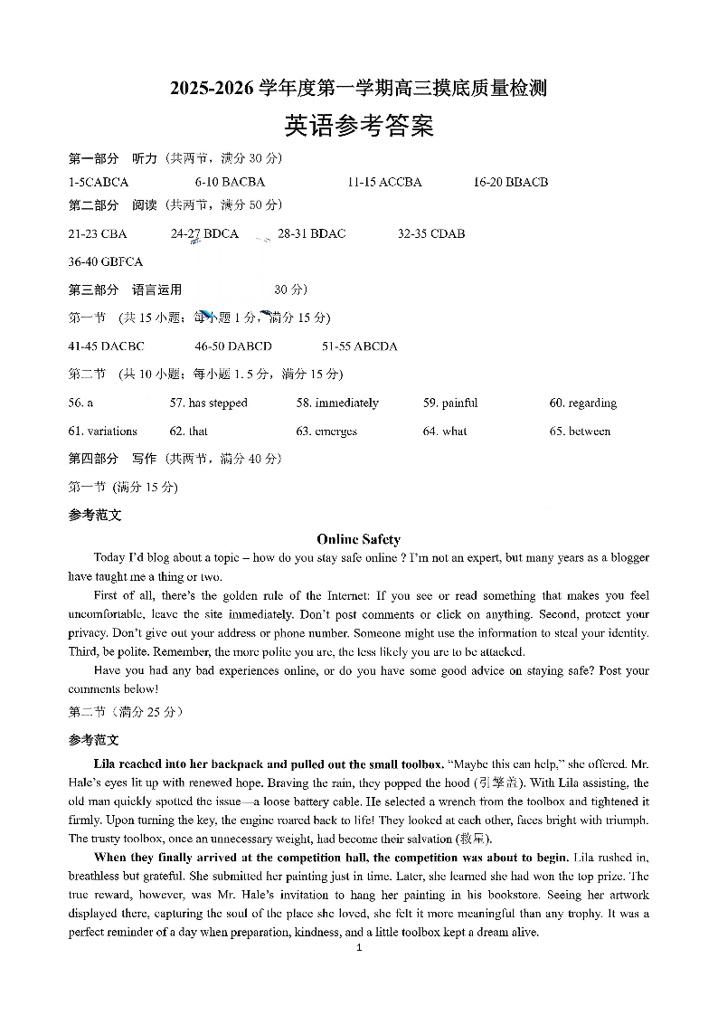 英语答案-2026届山东省淄博市第一学期高三摸底质量检测(期末).pdf