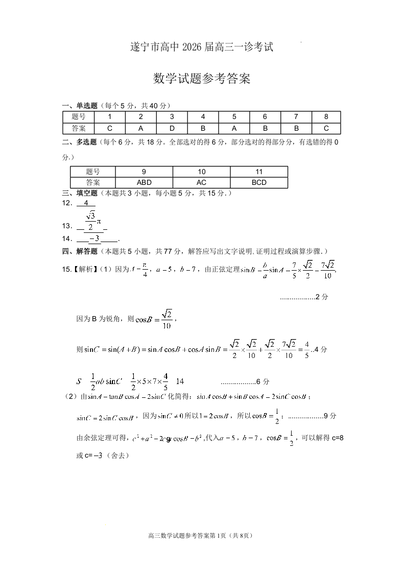 遂宁市高中2026届高三一诊考试 数学答案.docx