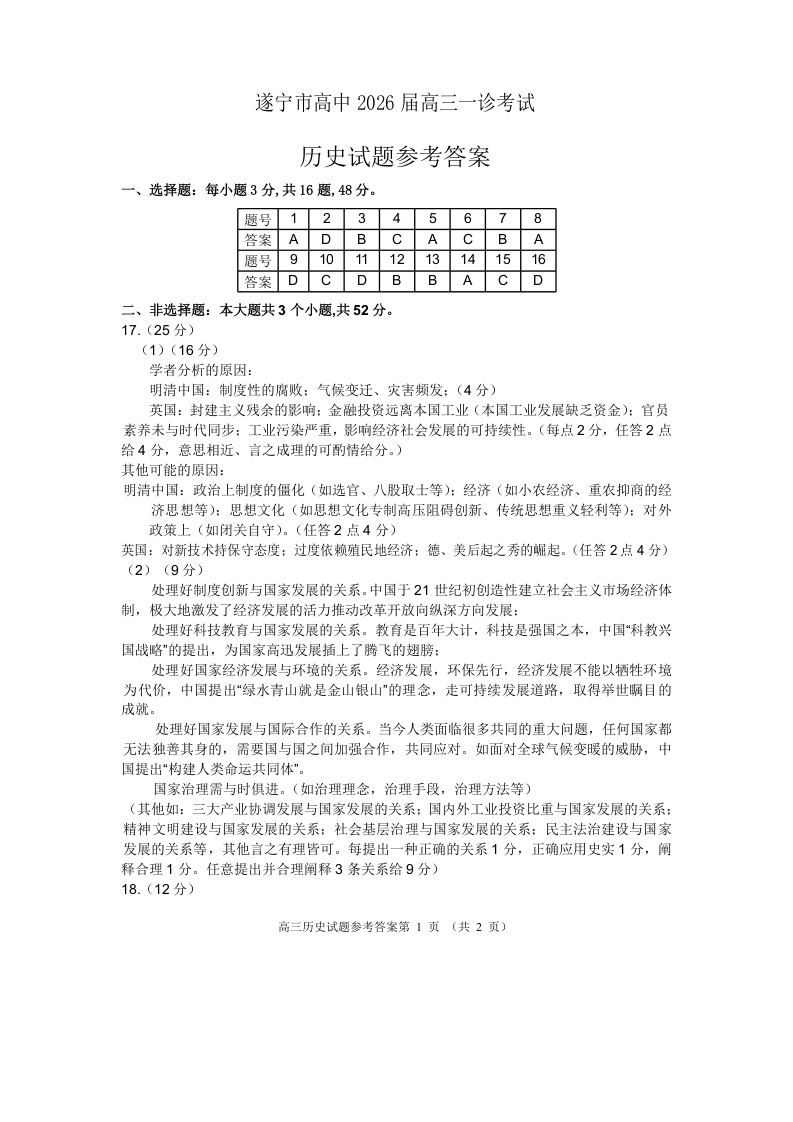 遂宁市高中2026届高三一诊考试 历史答案.doc