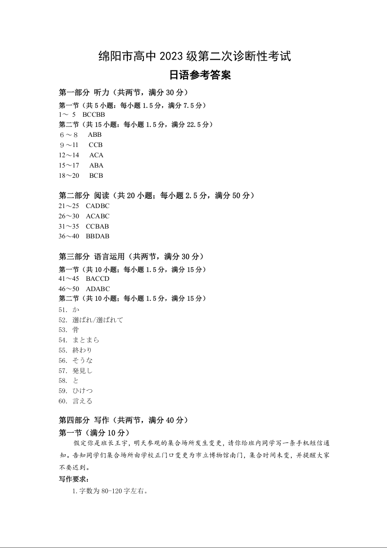 绵阳市高中2023级第二次诊断性考试 日语答案.docx