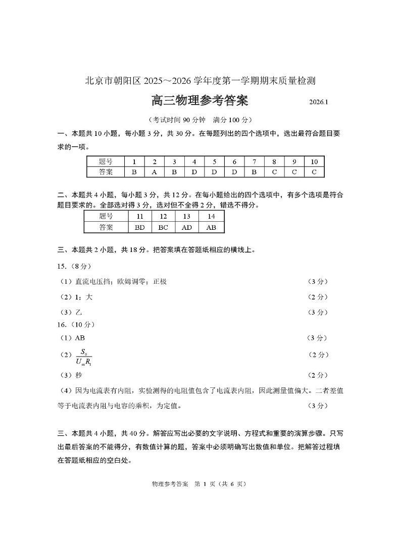 北京市朝阳区2025-2026学年度高三第一学期期末质量检测 物理答案.pdf
