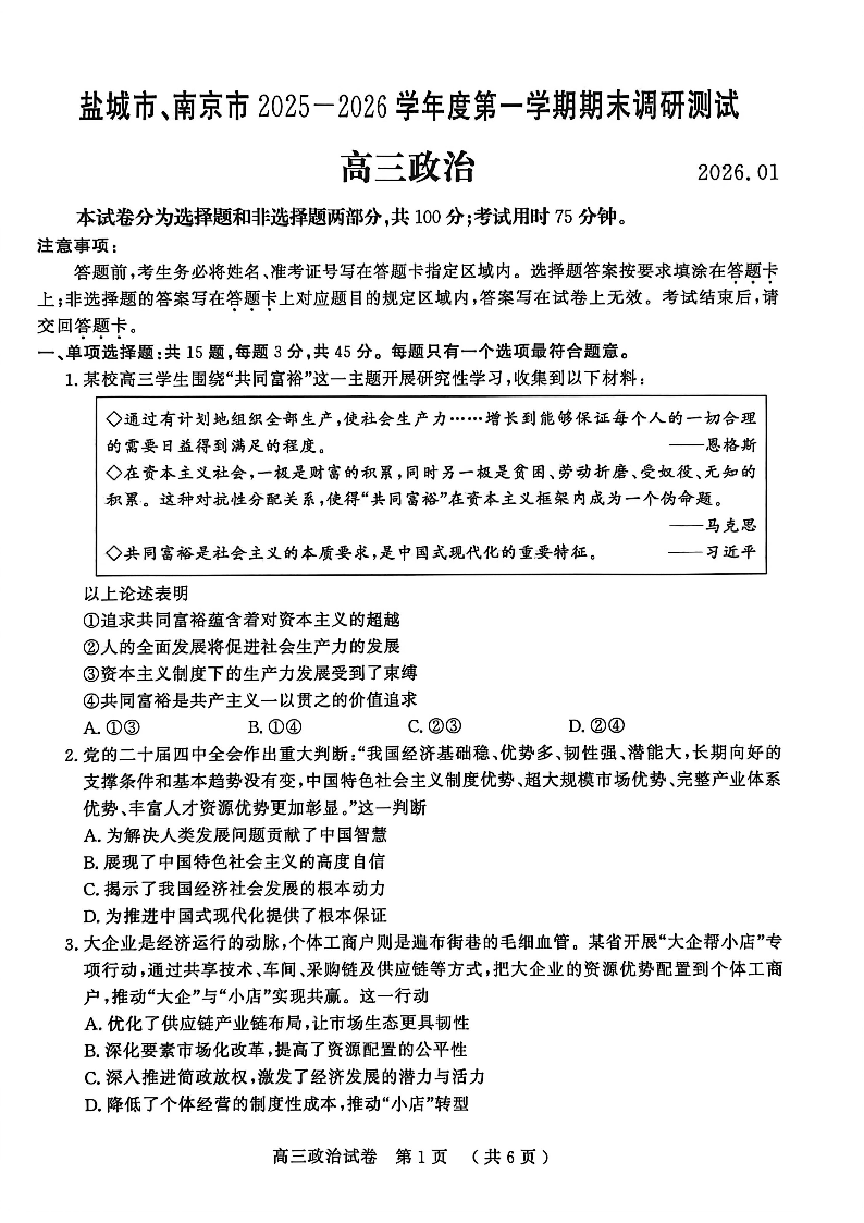 江苏省南京市、盐城市2025-2026学年高三上学期期末调研测试 政治.pdf