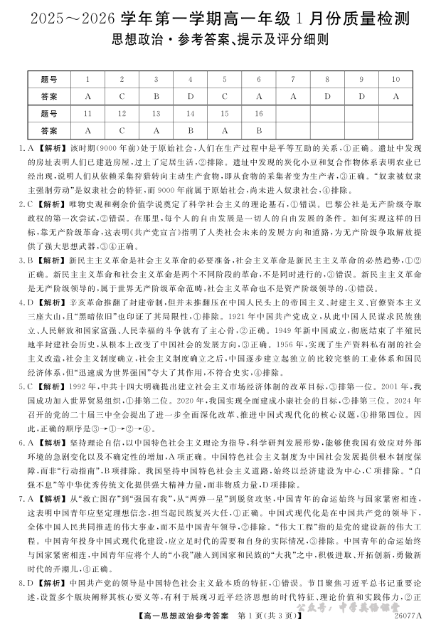河北省石家庄市七县联合体2025-2026学年高一上学期1月月考 政治答案.pdf