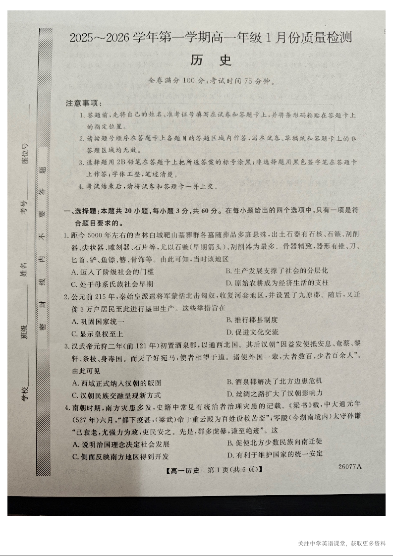 河北省石家庄市七县联合体2025-2026学年高一上学期1月月考 历史.docx