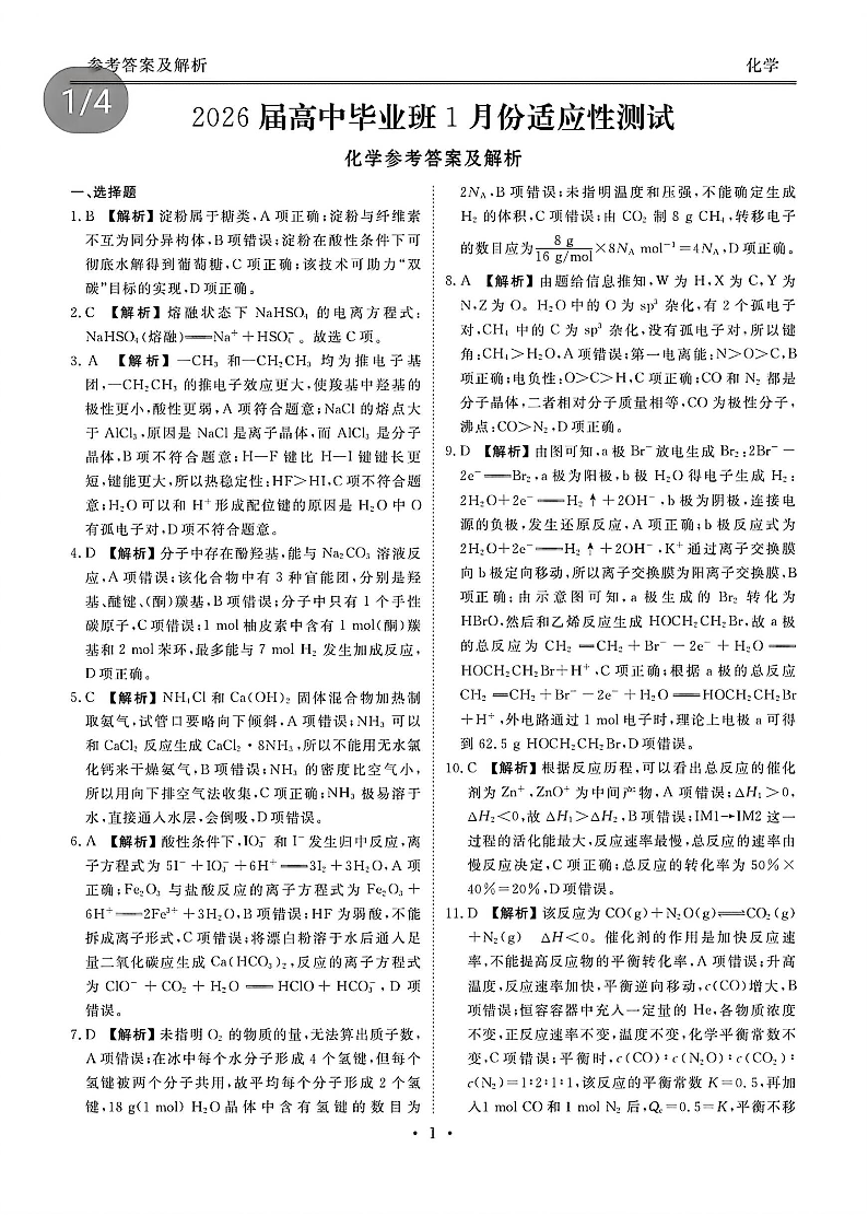 广西壮族自治区玉林市、贵港市等市2026届高中毕业班1月份适应性测试 化学答案.pdf
