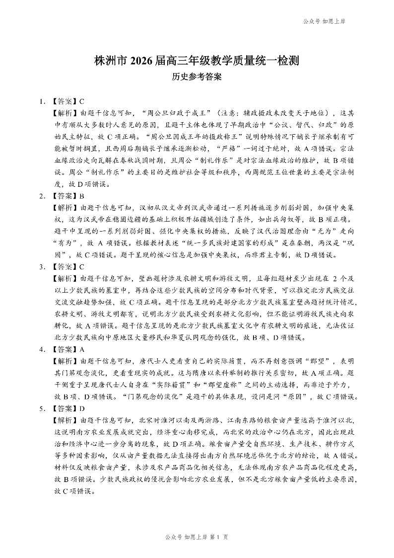 湖南省株洲市2026届高三年级教学质量统一检测 历史答案.pdf