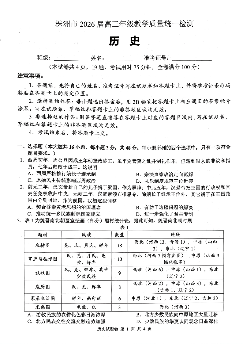 湖南省株洲市2026届高三年级教学质量统一检测 历史.pdf