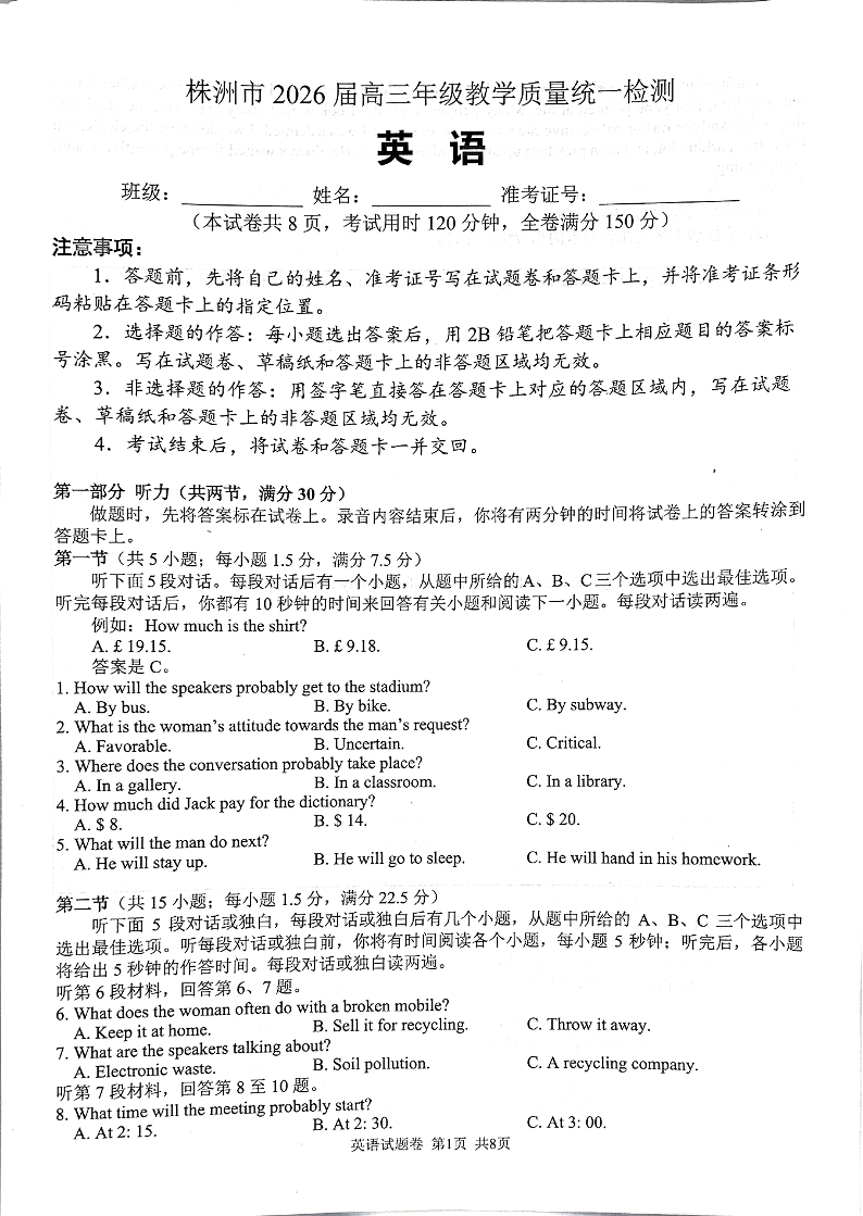 湖南省株洲市2026届高三年级教学质量统一检测 英语.pdf