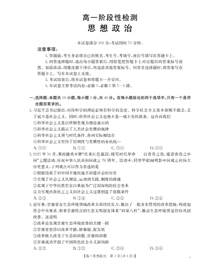 甘肃省天水市2025-2026学年高一上学期1月月考阶段性检测 政治.pdf