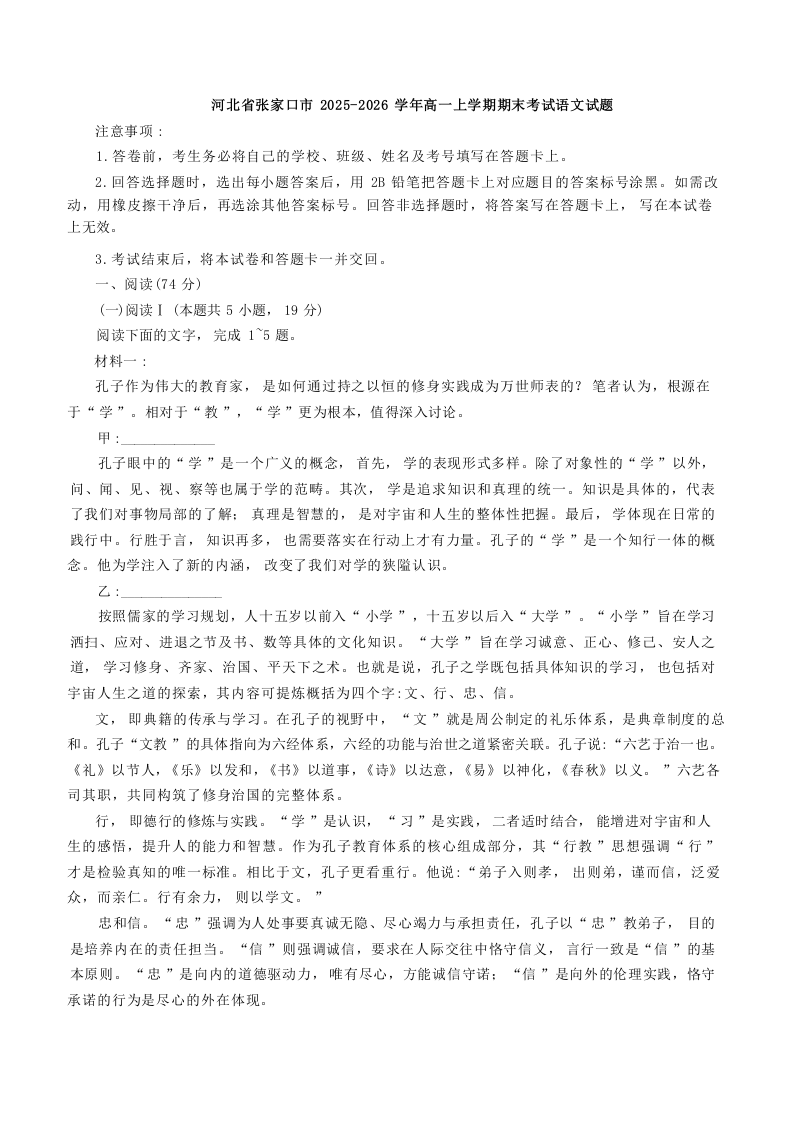 张家口市2025-2026学年高一年级第一学期期末教学质量监测 语文试题(含答案).docx