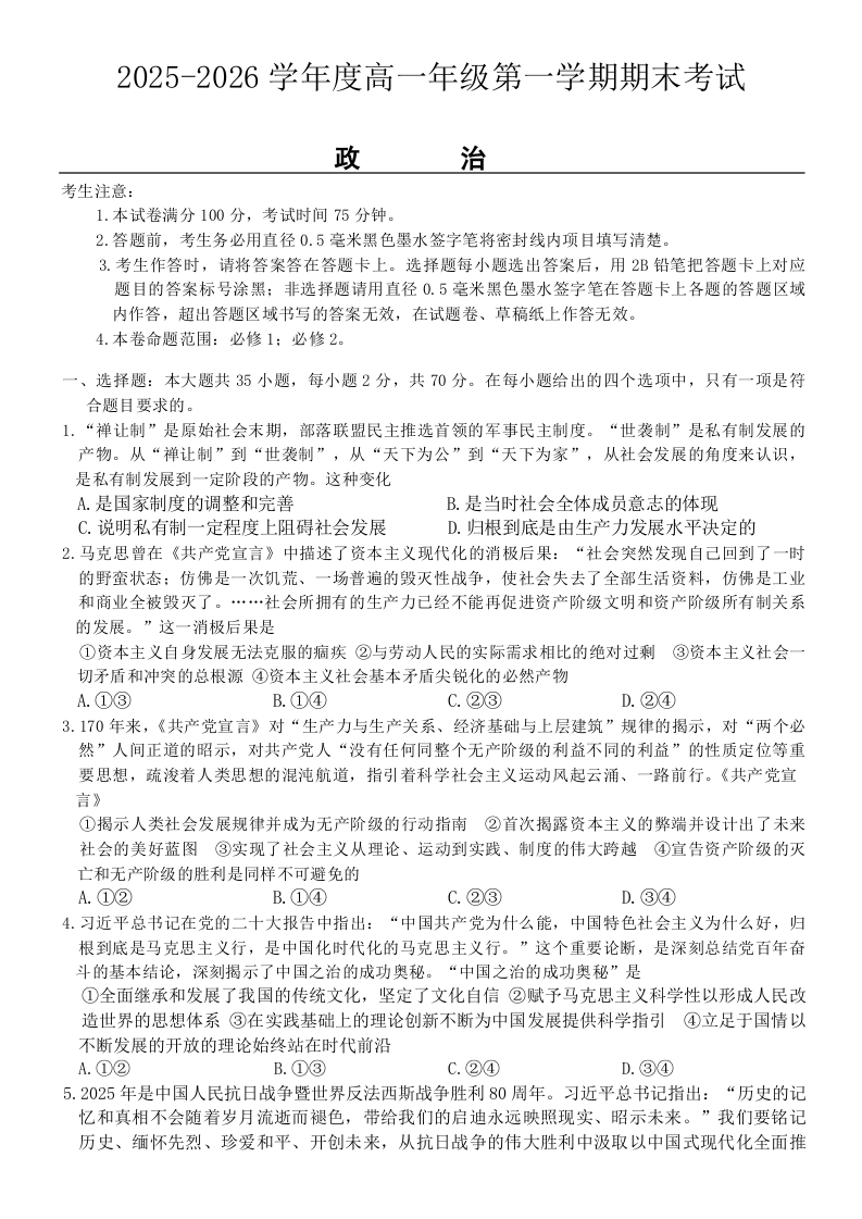 黑龙江省龙东十校联盟2025-2026学年高一上学期期末考试 政治试题(含答案).docx