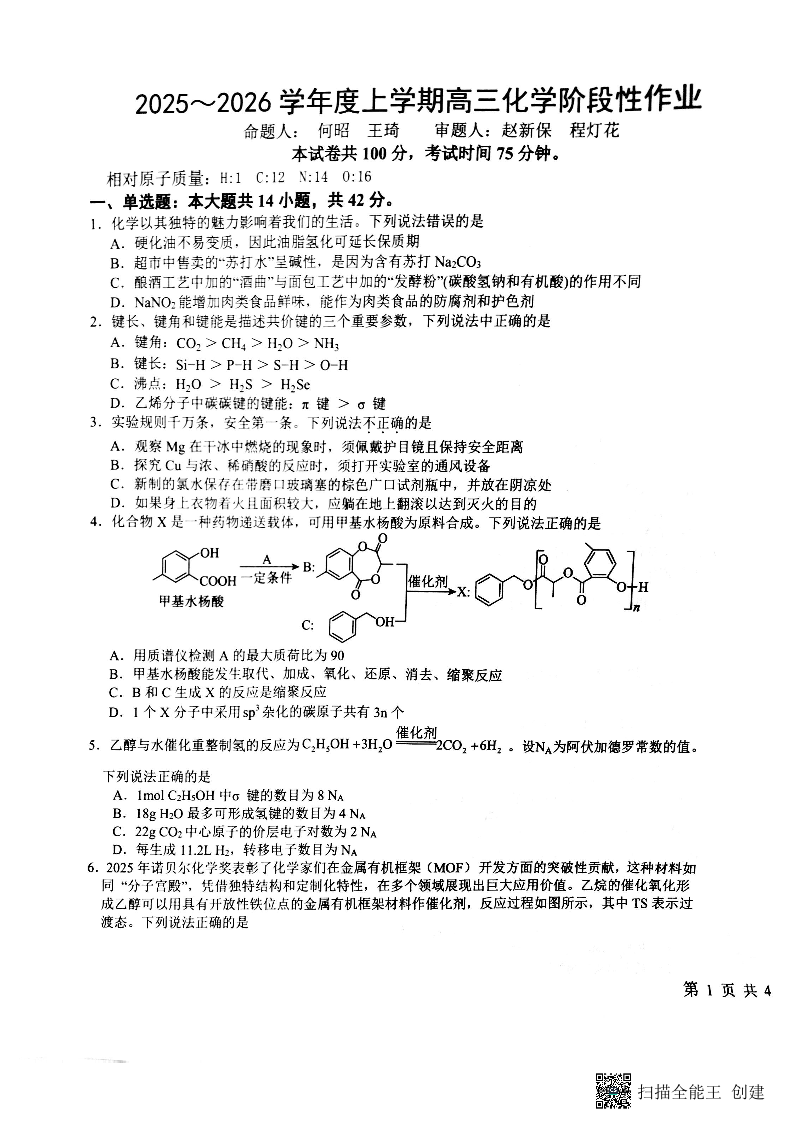 五市十校协作体2025-2026学年高三上学期1月期末阶段性作业 化学.pdf