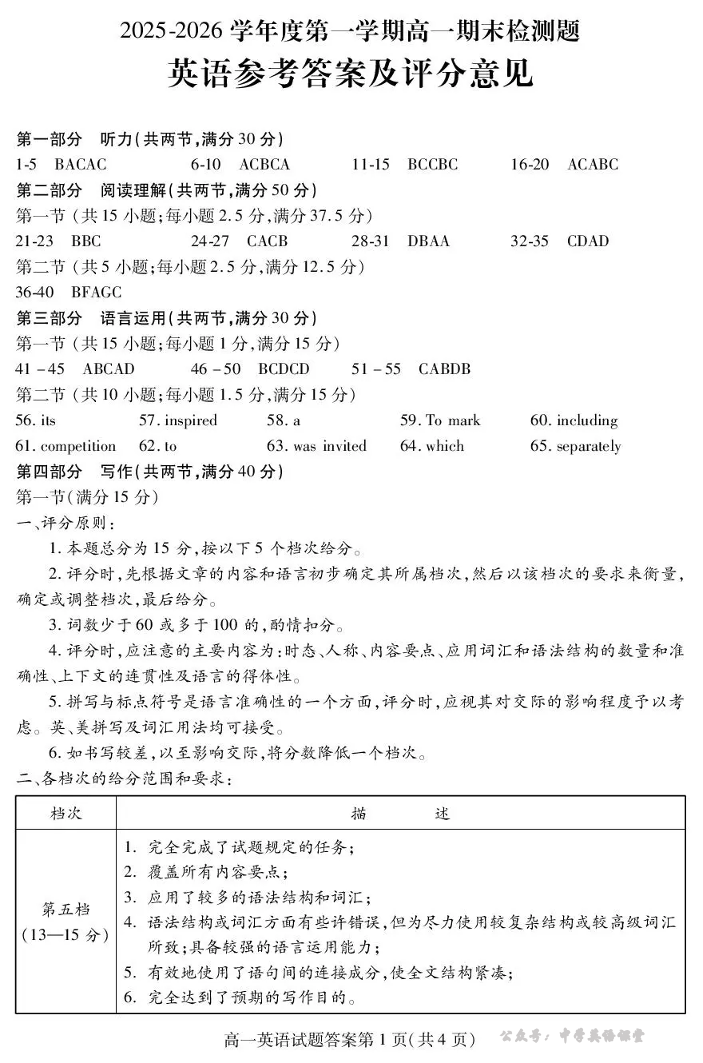 内江市2025-2026学年度第一学期高一期末检测题 英语答案.pdf