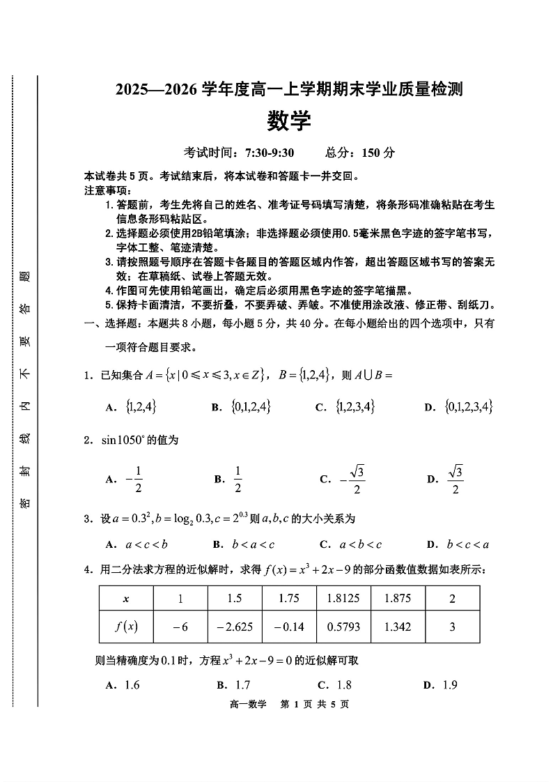 延边朝鲜族自治州2025-2026学年度上学期高一年级期末学业质量检测 数学试题(含答案).pdf